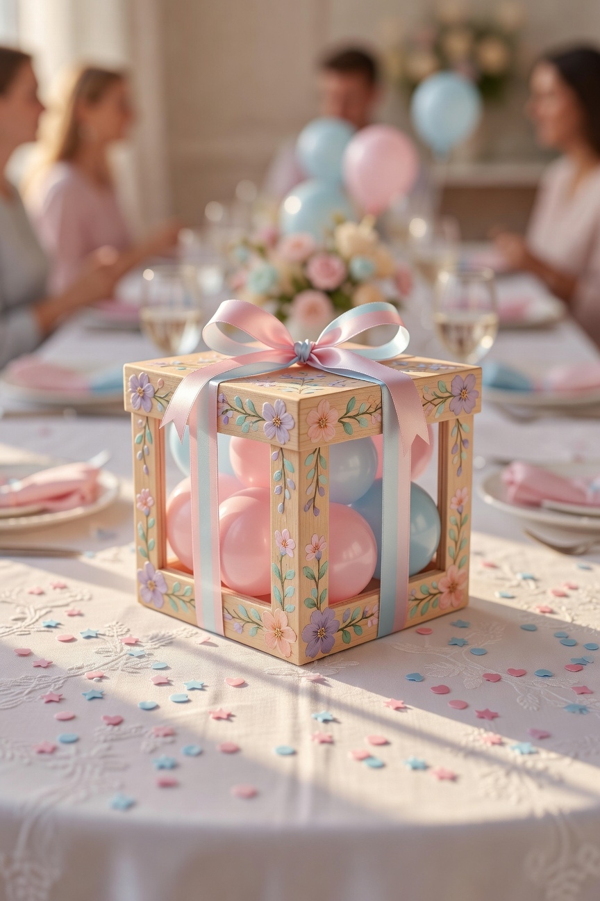 What if every guest got a little mystery of their own? Hand out decorated favor boxes with either pink or blue surprises inside. Let the mystery box excitement grow as everyone opens theirs at once. You’ll see smiles when surprise reveal anticipation pays off. It’s safe, sweet, and simple. Each box becomes a keepsake. You’ve got this, just add confetti, seal the lid, and enjoy the joy.